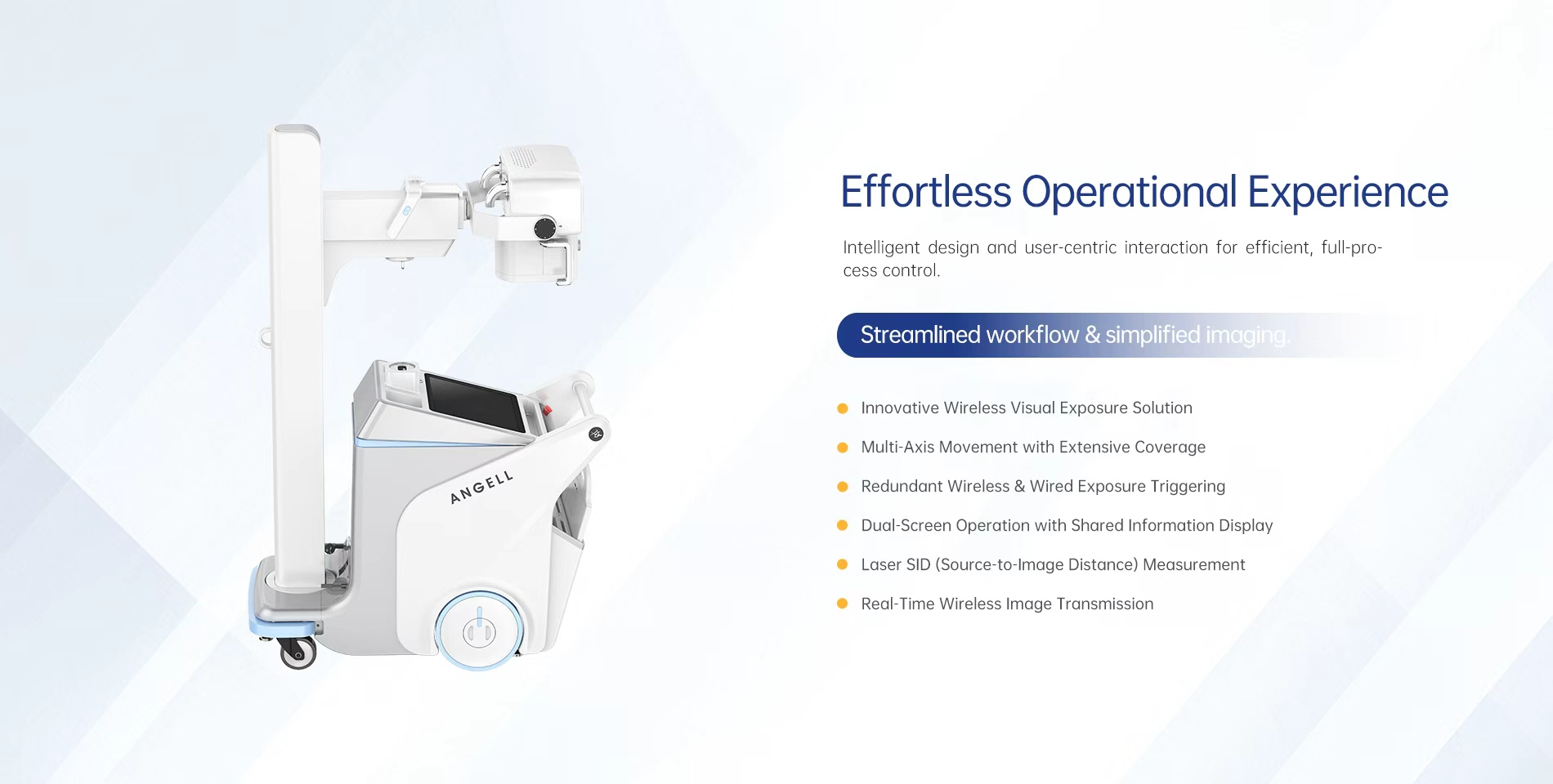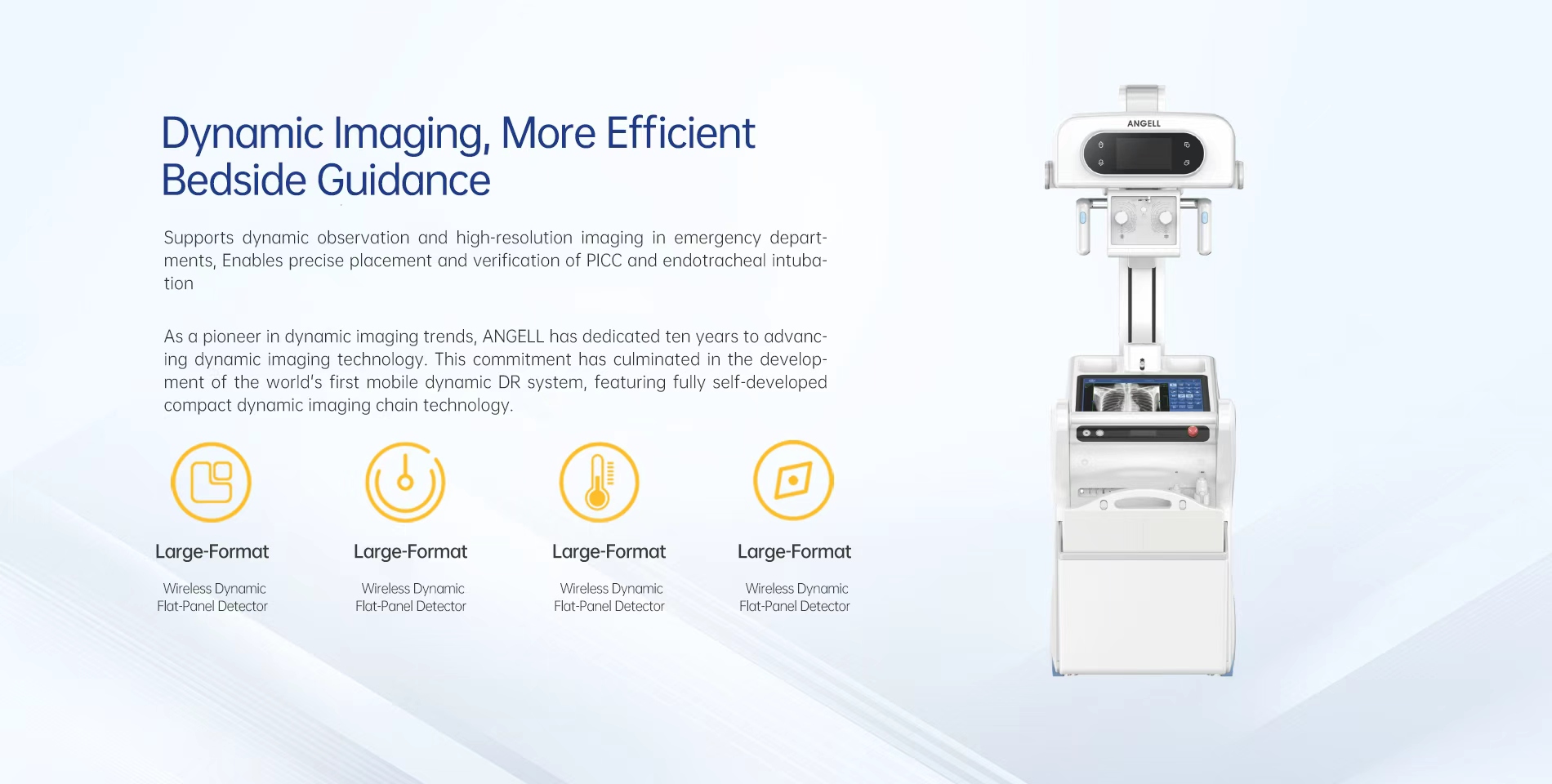 Pionnier des tendances en imagerie dynamique, ANGELL a consacré dix ans au développement de la technologie d'imagerie dynamique. Cet engagement a abouti au développement du premier système DR dynamique mobile au monde, intégrant une technologie de chaîne d'imagerie dynamique compacte entièrement auto-développée.