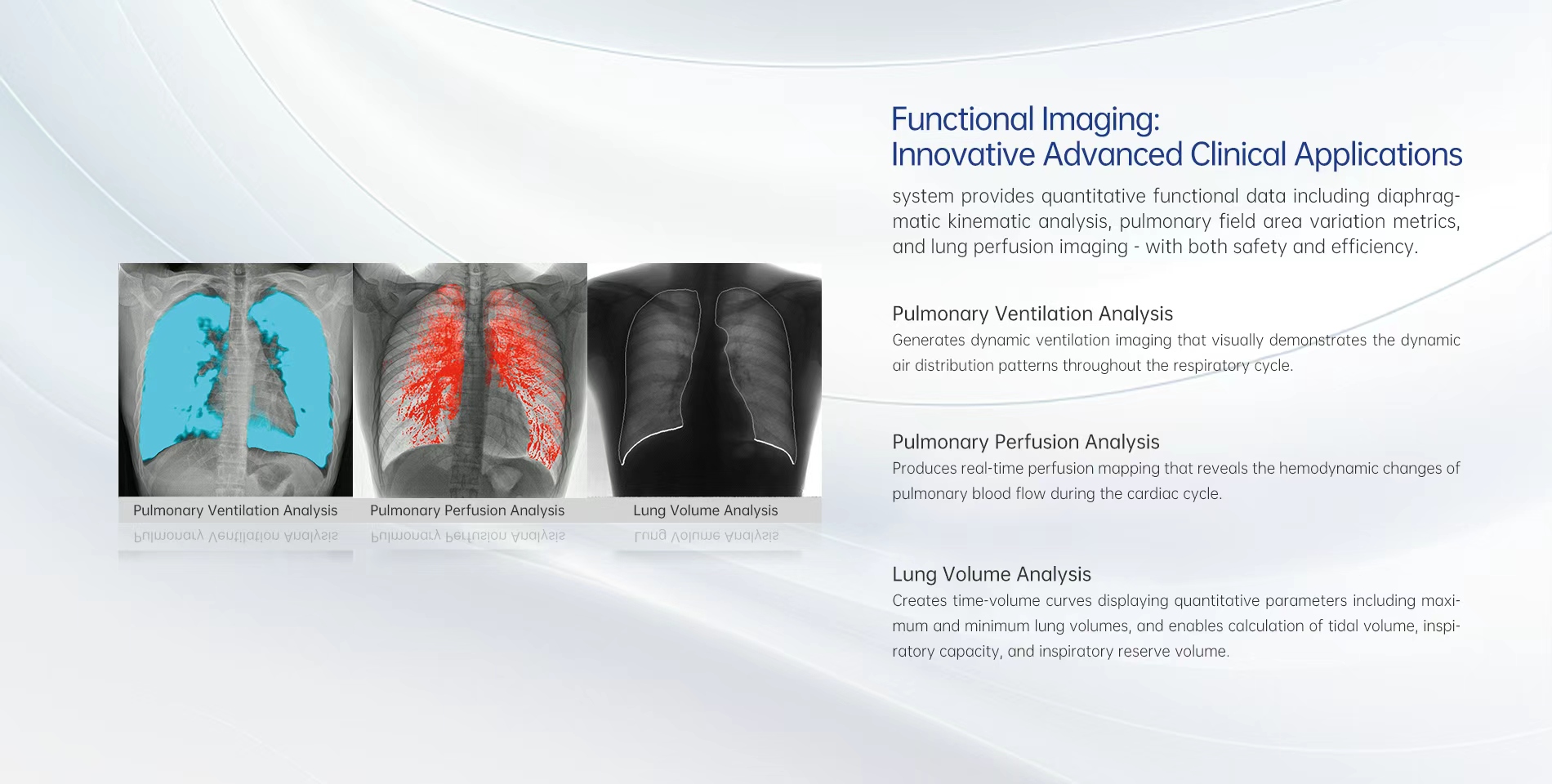 Le système fournit des données fonctionnelles quantitatives incluant l'analyse cinématique du diaphragme, les métriques de variation de la surface du champ pulmonaire et l'imagerie de perfusion pulmonaire - alliant sécurité et efficacité.